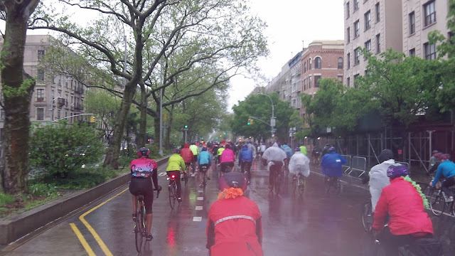 After the first few miles we hit Central Park. This would be the first real test of my legs on this ride, there are a couple of hills and lots of opportunities to crash. Fortunately I made it through Central Park without a hiccup. The rain kept many riders away and the ones who did show up seems prepared to ride in the wet conditions. I've been a volunteer in the past and have seen first hand wet road related wipeouts and crashes.